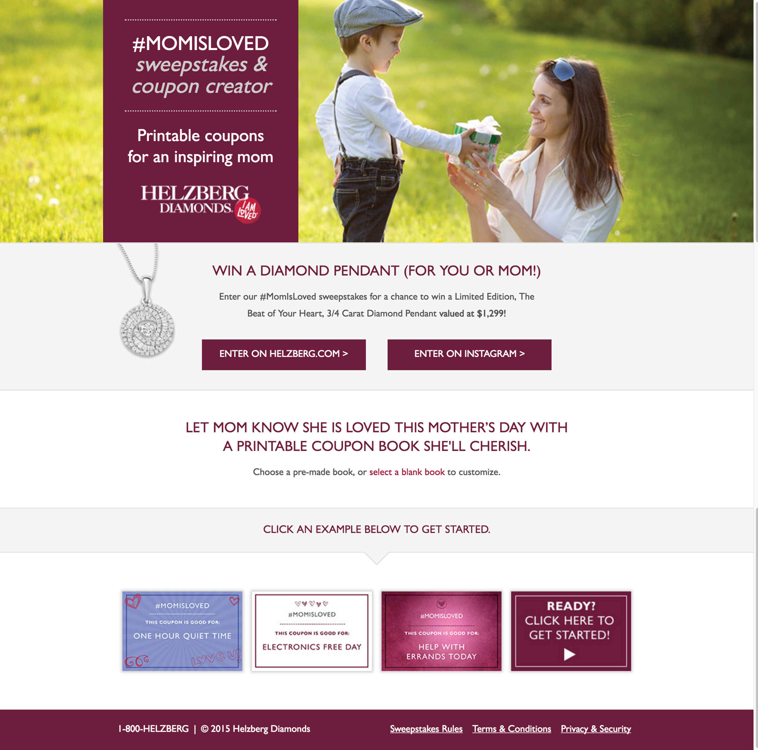 Helzberg Diamonds wanted to celebrate Mother's Day with a sweepstakes. We were tasked with creating an online sweepstakes that celebrated Mom and let her know that she is loved, aligning with the brand's purpose. We developed a coupon creator that allowed users to print pre-written or customizable coupons to gift to Mom. Creating a coupon book was a form of entry into the sweepstakes, but entrants also had the option of skipping the coupon book and entering a simple online form. We also created a third entry option on Instagram which involved Helzberg's followers posting content using the #MomIsLoved hashtag. I developed copy for the campaign, as well as the social media messaging that drove traffic to the sweepstakes.